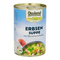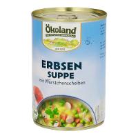 Trinkwasser, 23% Erbsen*, Fleisch* (Schwein*, Rind*), Kartoffeln*, Karotten*, Lauch*, Zwiebeln*, Sonnenblumenöl*, SELLERIE*, Steinsalz, Maisstärke*, Meersalz, Verdickungsmittel: Guarkernmehl*; Rohrohrzucker*, Gewürze* (Macis*, Curcuma*, Pfeffer*, Ingwer*, Knoblauch*, Koriander*, Kümmel*), Kräuter* (Liebstöckel*, Petersilie*, Rosmarin*, Oregano*), Dextrose*, Schafsaitling, Rauch.| Energie | Fett | gesättigte Fettsäuren | Kohlenhydrate | Zucker | Ballaststoffe | Eiweiss | Salz |