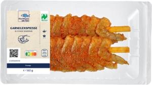 GARNELENSPIESSE aufgetaut, zum Gekochtessen.Zutaten: GARNELEN*** 97% (panaeus vannamei), Bio Trockenmarinade [Paprika, Zwiebel, Pfeffer, Koriander, Kümmel, Chilli, Karotten, Lauch, Meersalz, Hefeextrakt, Glucosesirup, natürliches Aroma]*Hergestellt nach Naturland-Richtlinien BN 1100804* Zutaten aus kontrolliert biologischer Herkunft *** aus Aquakultur in Ecuador