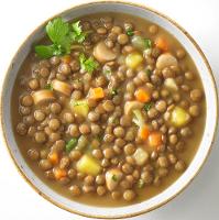 Trinkwasser, 19% Linsen*, Fleisch (Schwein*, Rind*), Karotten*, Kartoffeln*, Zwiebeln*, Lauch*, SELLERIE*, Sonnenblumenöl*, Steinsalz, Maisstärke*, Rohrohrzucker*, WEIZENMEHL*, Meersalz, Verdickungsmittel: Guarkernmehl*; Tomatenmark*, Branntweinessig*, Gewürze* (Macis*, Curcuma*, Pfeffer*, Ingwer*, Knoblauch*, Koriander*, Kümmel*), Kräuter*(Liebstöckel*, Petersilie*, Rosmarin*), Dextrose*, Schafsaitling, Rauch.| Energie | Fett | gesättigte Fettsäuren | Kohlenhydrate | Zucker | Ballaststoffe | Eiweiss | Salz |
