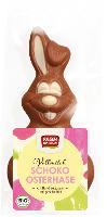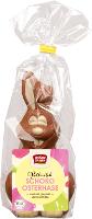 Lachender Osterhase aus Vollmilchschokolade - liebevoll von Hand mit weißer Schokolade geschminkt.