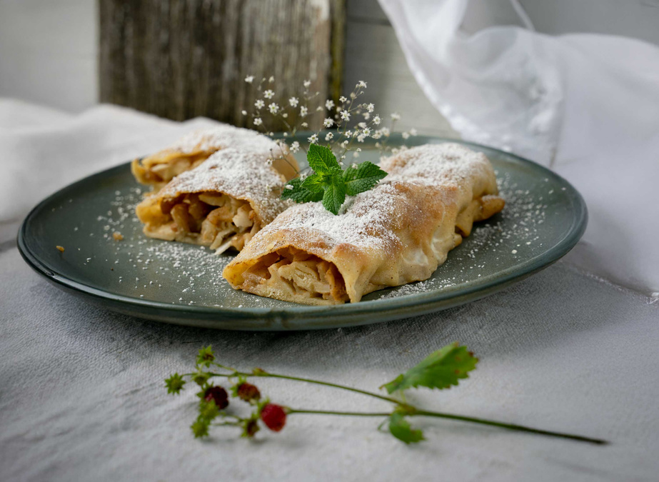 Aus Mehl, Salz, Rapsöl, Ei und 125 ml lauwarmem Wasser einen Strudelteig herstellen und in 4 Stücke teilen. Zugedeckt ca. 30 Minuten ruhen lassen. Hierfür einen Topf mit heißem Wasser ausspülen, abtrocknen, den Topfboden mit Backpapier belegen (dieses kann später zum Belegen des Backblechs verwendet werden) und die Teigstücke daraufsetzen. Den Topfdeckel auflegen und so geschlossen warm stehen lassen. So wird der Teig elastisch und sehr gut zum Verarbeiten.