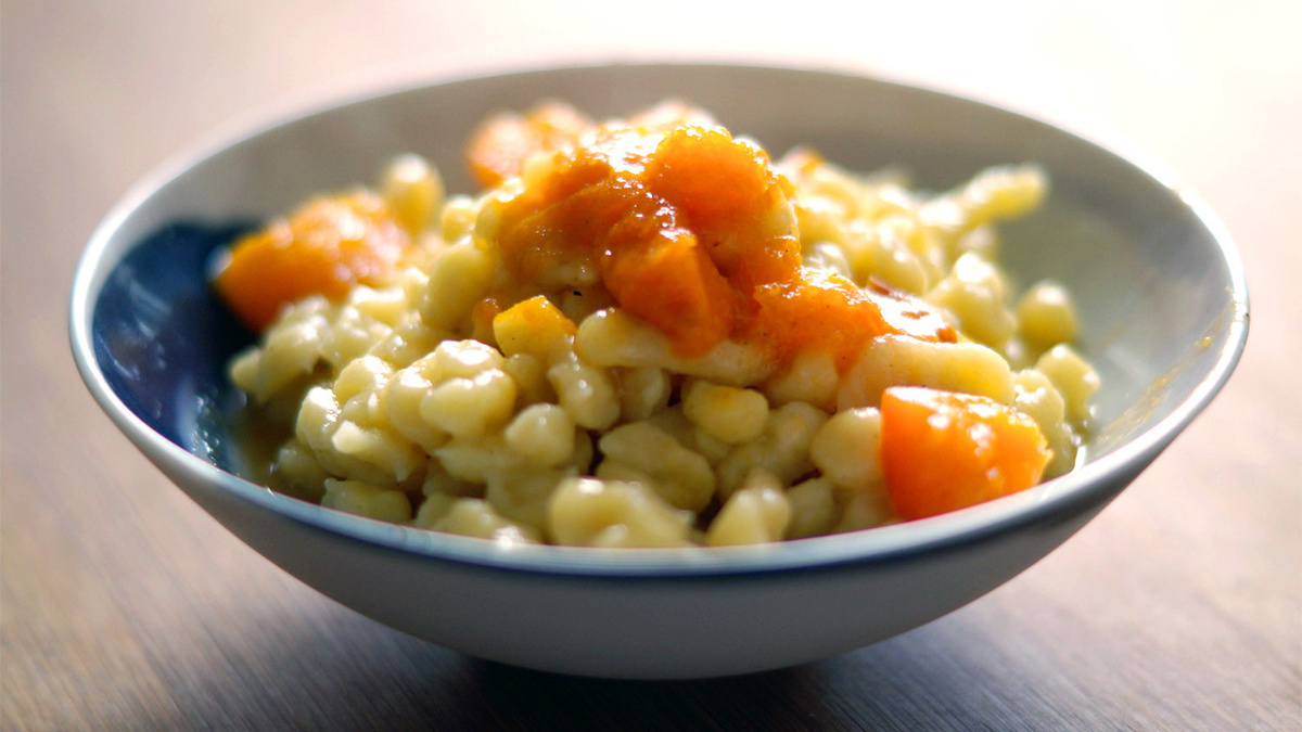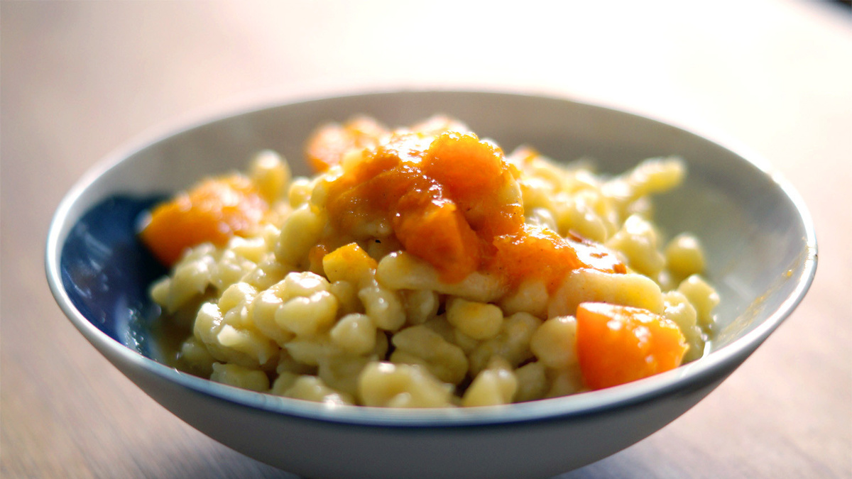 Zuletzt die Butter dazugeben, schmelzen lassen und die heißen Spätzle mit der Aprikosensoße servieren. Guten Appetit.