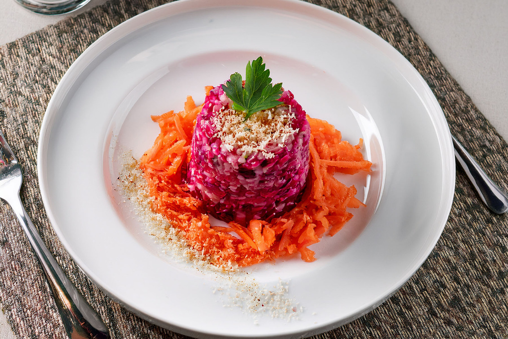 Die Möhren auf vorgewärmten Tellern anrichten und den Reis darauf setzen.