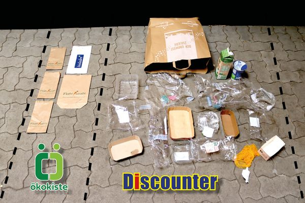 Der Einkauf der gleichen Produkte aus einem Discounter ergab eine erhebliche Menge an Verpackungsmüll.